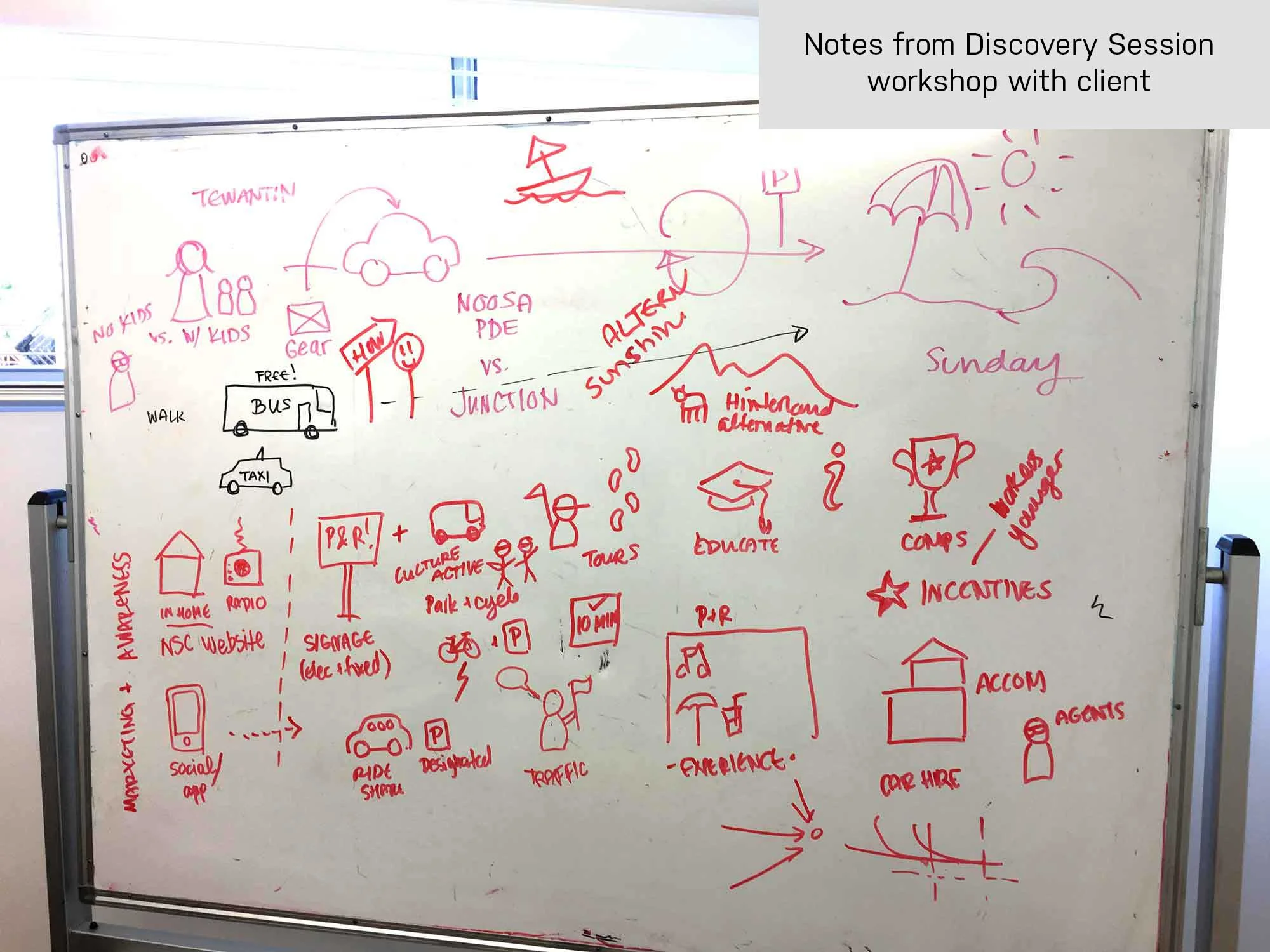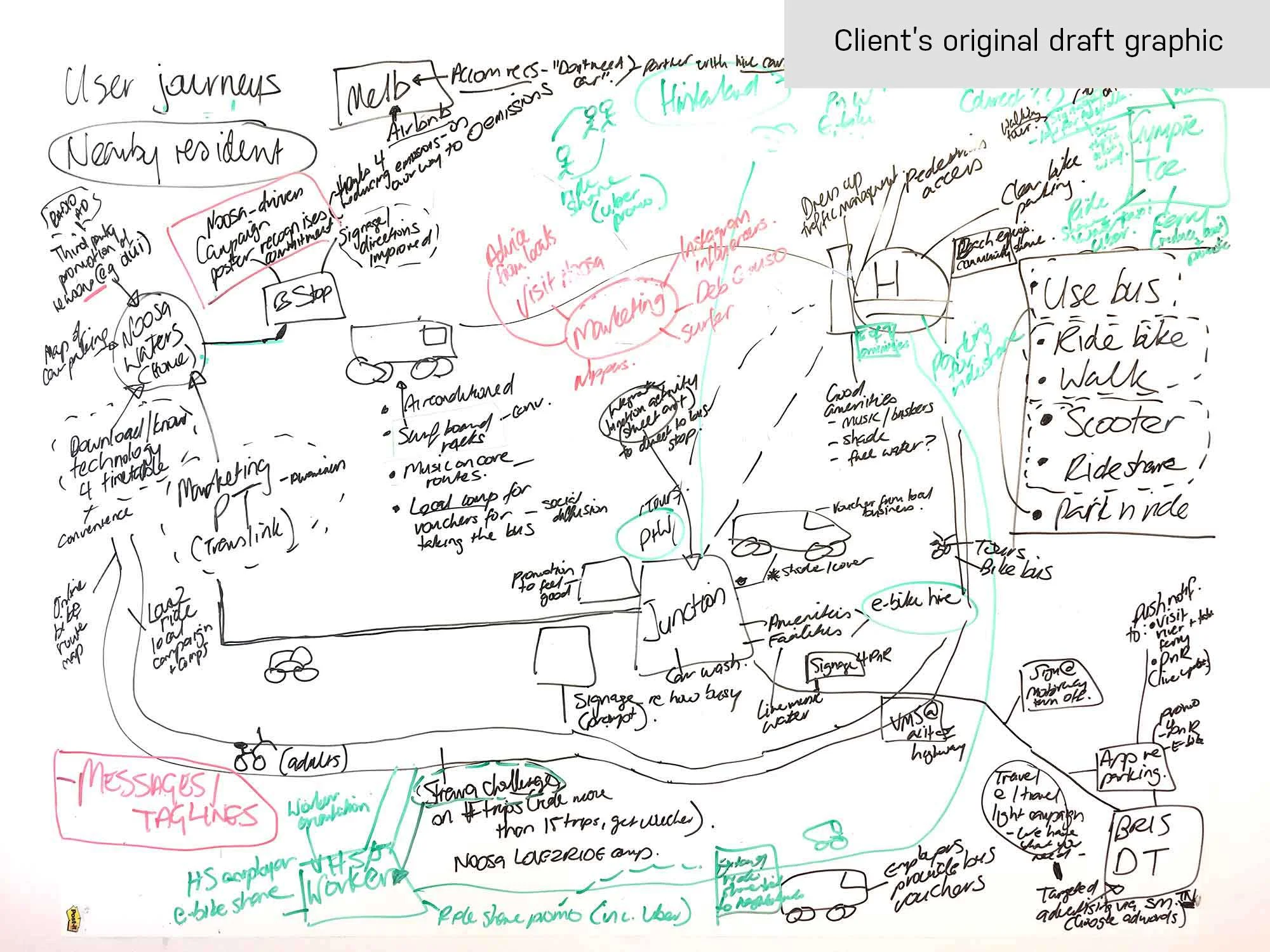 The project began with a two-hour Discovery Session to better understand the client’s work and help them articulate the story they wanted to tell through the journey map illustration. The final graphic shows multiple user journeys with different transport options and highlights design interventions to encourage people to take alternative transport options.
